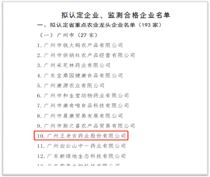 王老吉藥業擬認定為“廣東省重點農業龍頭企業”