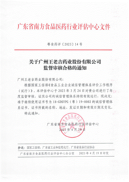 4月19日,公司獲得省食品醫(yī)藥行業(yè)評估中心發(fā)出的誠信體系合格認證,廣東省食品醫(yī)藥行業(yè)評估中心是國家工信部指定委托的、廣東省唯一的一家食品工業(yè)企業(yè)誠信管理體系評估機構。從2013年首批國家誠信體系認證至今,王老吉藥業(yè)連續(xù)十一年通過誠信體系的認證,充分體現(xiàn)了王老吉人始終不渝地遵循“老老實實王老吉,萃取本草之精華,煉制快樂之人生,超越自我創(chuàng)一流”這一誠信理念,自覺履行企業(yè)的社會責任,為消費者提供安全優(yōu)質的健康產品。