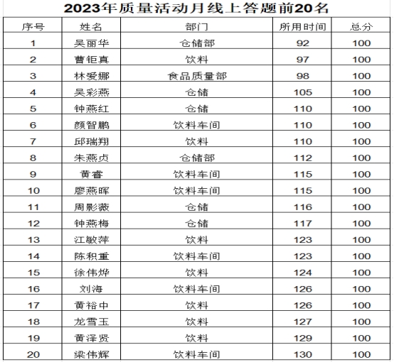 首先登場的節目是食品安全和ISO9001、ISO22000雙體系知識競賽,此競賽是本次質量月活動的重點項目,分為線上、線下兩種競賽方式,其中線上通過二維碼參與,截止后共有1376人參與(基本涵蓋食品相關的人員,體現食品安全,全員參與的質量方針),其中滿分231人,最快成績92秒,平均一秒多一道題。以下為滿分且速度較快的前20名:
