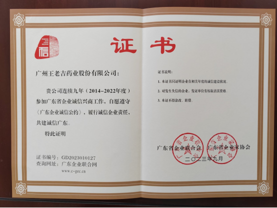 2023年9,廣州王老吉藥業股份有限公司連續九年獲得“廣東省誠信興商企業”證書。