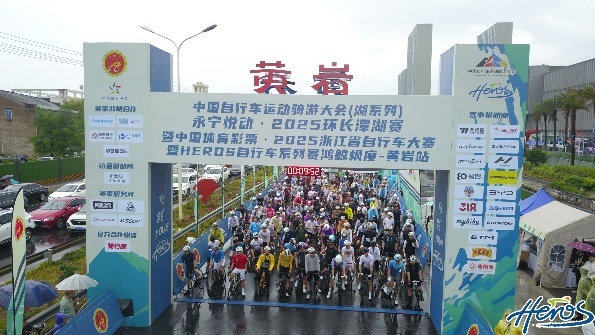 5月浙江省自行車大賽黃巖站——環長潭湖自行車賽在雨中開賽,在長達100公里的賽道上,王老吉核桃乳與騎手共赴風雨征程。 -