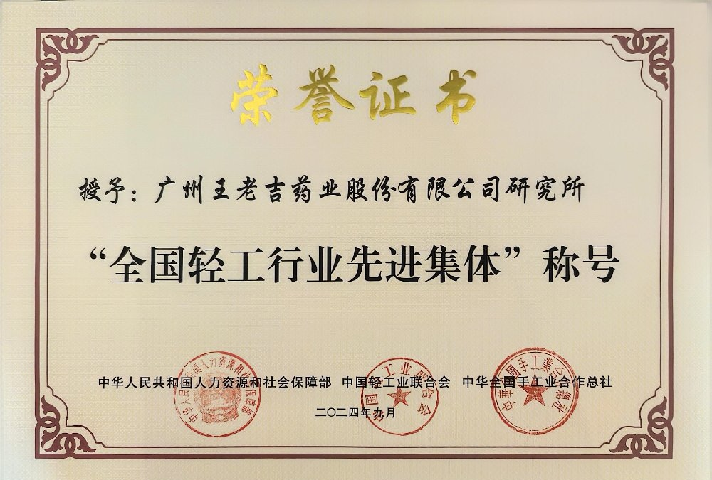 王老吉藥業(yè)研究所榮獲“全國輕工行業(yè)先進(jìn)集體”稱號。 -