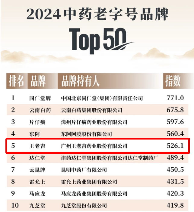 王老吉藥業榮登2024中藥老字號品牌TOP50,位列第五!