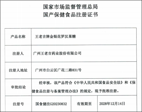 王老吉藥業(yè)獲得國(guó)家市場(chǎng)監(jiān)督管理總局頒發(fā)的“王老吉牌金銀花羅漢果糖”國(guó)產(chǎn)保健食品注冊(cè)證書,至此,王老吉藥業(yè)擁有了中成藥、保健食品、普通食品三類產(chǎn)品,業(yè)務(wù)板塊不斷擴(kuò)大,本草潤(rùn)喉糖果產(chǎn)品群不斷壯大。 -